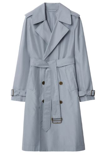 2025年夏コレクションでも、バーバリーらしいエレガントでありながらも機能的なトレンチコートが登場しています。特に注目したいのが、淡いブルーのシルクブレンドを使用した高品質なトレンチコートです。
